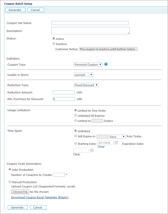 When you want to have coupon codes in a certain format, select Manual Production to upload the coupon batch excel file prepared in advance. ● To prepare the coupon batch file, click Download Coupon Excel template (empty) link and save the template to your computer. ● To upload the manually generated coupon file, click Choose File next to the Upload coupon list (supported formats: excel, CSV) field.