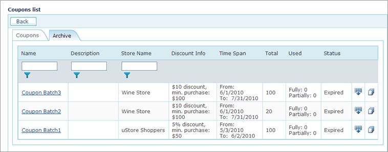A coupon batch cannot be restored from the archive. Instead, you can create a copy of the archived coupon batch by using the Duplicate operation. The coupon batch will then be saved in the Coupons tab.