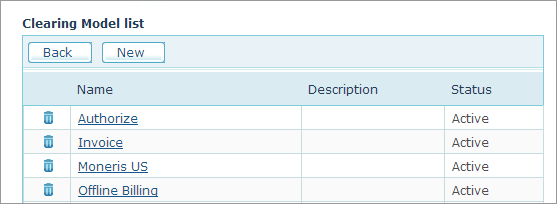The Clearing Model list includes a list of all pre-configured clearing models. The Invoice and Offline Billing clearing models are available by default. Naturally, you can use or modify them as necessary.