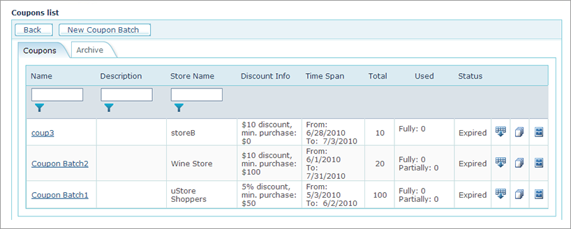 The Name, Description and Store Name fields can be filtered by writing the coupon batch name, description or store name (respectively) in the Filter box and clicking the Filter icon.