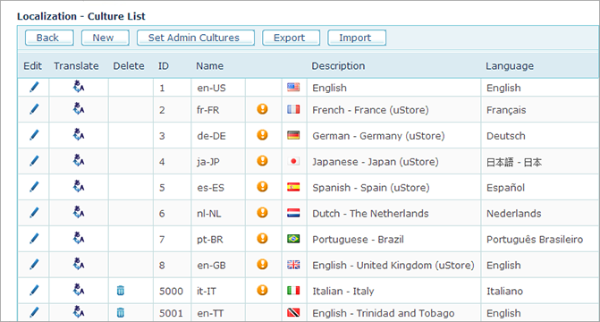 You can add a culture, edit culture properties, translate Storefront and Back Office labels and menus to the selected language and delete a culture. Note that out-of-the box cultures and cultures already used in stores cannot be deleted.