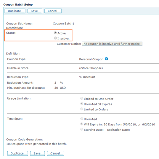 2. Modify the coupon batch status by selecting the Active or Inactive in the Status field. In case Inactive status is selected, you may change the Customer Notice as needed.