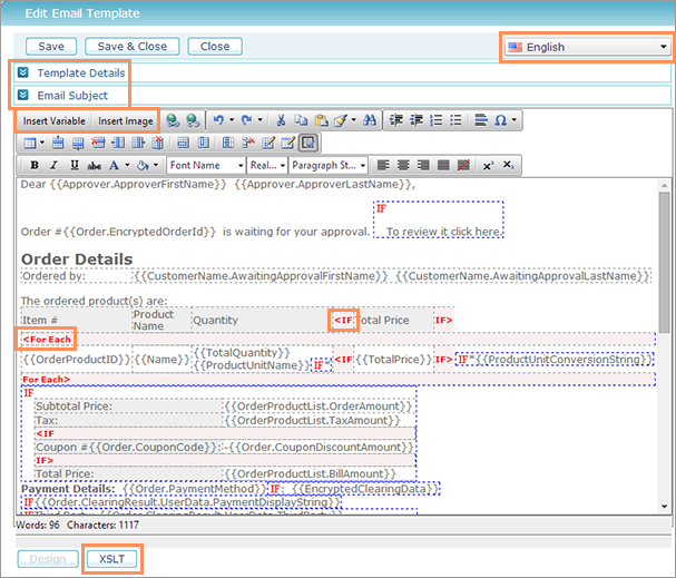 3. At the top right corner, choose the language in which you want to edit the template, and then edit the content using the available editing options. You can edit the template using either the Design or the XSLT mode.