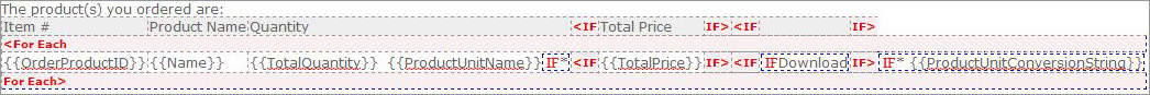 Parts of the template may be displayed or hidden according to a certain logic. These settings will be enclosed by a red IF label.