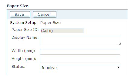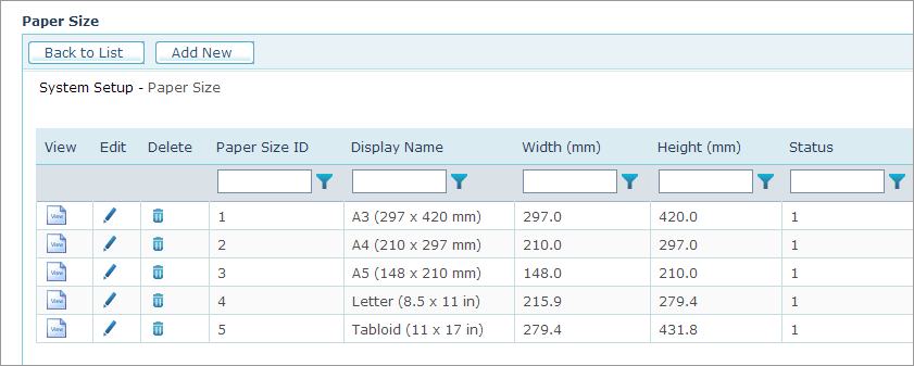 The Paper Size table lists all the predefined paper sizes in the store. This list is used when configuring the output paper size of Upload Products. Using the Paper Size table you can add more paper sizes.