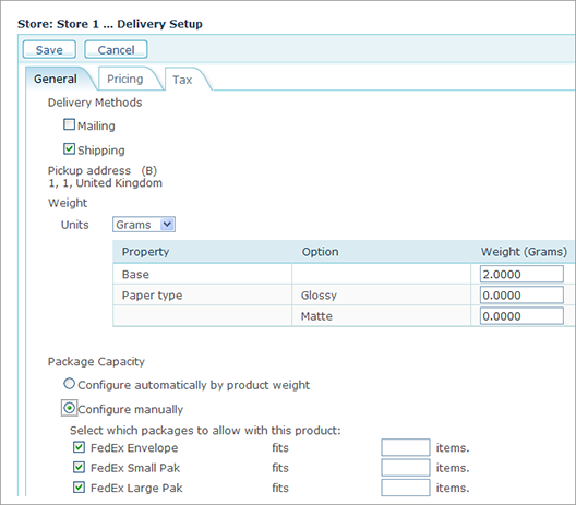 7. When you have finished setting up general delivery parameters, click the Pricing tab to define prices for weights, as explained in Setting Delivery Pricing Options.