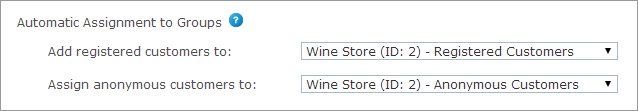 In the Automatic Assignment to Groups section, select the user group you want your registered and anonymous users to be part of. To assign a different user group to the store's users, you must verify that the user group is allowed for this store (in the Group editing page, Permissions tab).