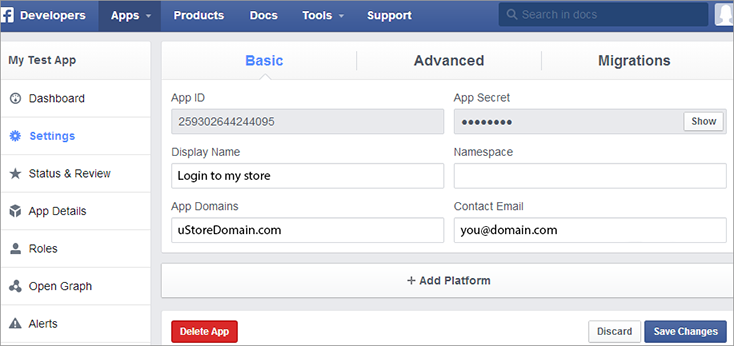 To be able to implement Facebook Login on your store, you first need to create an application in Facebook. When you set up the Facebook login on uStore, you will need the application ID provided by Facebook.