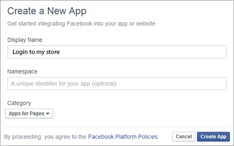 3. Enter a display name for the app, from the Category list choose a Apps for Pages, and then click Create App.