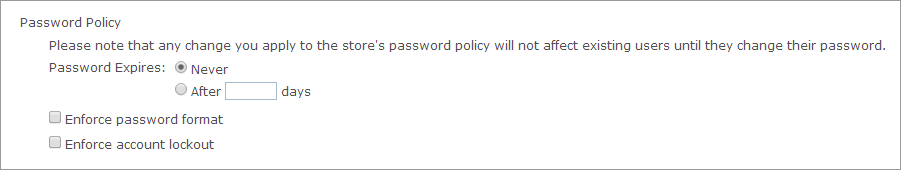 The Store administrator can set up a password policy for a store. This password policy, including lockout, history and expiration, will be enforced in the Storefront Login page where the customer is asked to enter a password in order to login to the application. The password format is enforced only when registering or updating the password.
