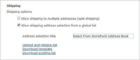 You can also enable your customers to select shipping addresses from a global address book. Once this option is selected, you can upload a global address book. The global address book can only contain countries and states (or provinces) marked as supported for a given store in the Supported Locations section of the Store Setup page.