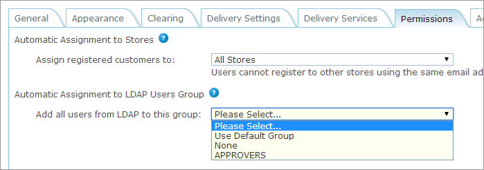 6. On the Permissions tab, under Automatic Assignment to LDAP Users Group, select a group from the list.