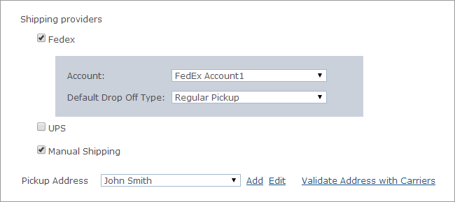 ● In the Shipping providers section, select the Fedex checkbox, and then select the Fedex Account you want to use, as defined in the uStore Presets.
