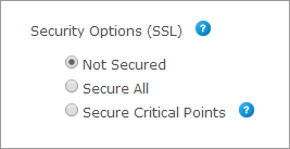 ● In the Security Options (SSL) section, select Not Secured if you do not want the store to be secured by SSL. This option is useful while you are working offline and are in the process of setting up the store. Once you make the store available online, make sure you change this setting to either Secure All or Secure Critical Points.
